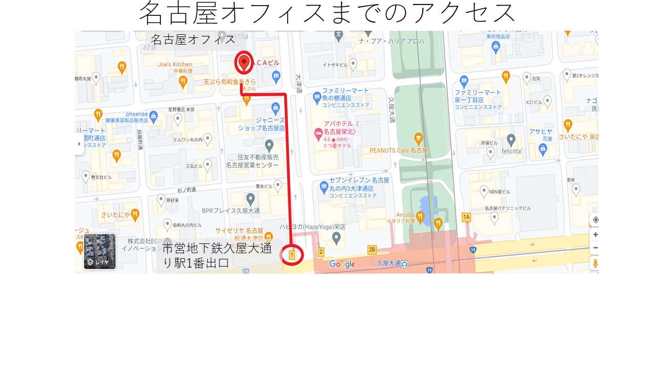 名古屋市営地下鉄久屋大通駅[1番出口](1A、1B出口ではありません)を出て、北を向いて大津通を4分ほど歩きます。右手にみえるアパホテルを過ぎてファミリーマートがある交差点(「丸の内3」信号)を左に曲がります(魚ノ棚通を西方向へ進みます)。すぐに、右手にACAビルがみえますので、奥のエレベーターを使って5階エントランスにお越しください。弊社担当者が面接室にご案内いたします。